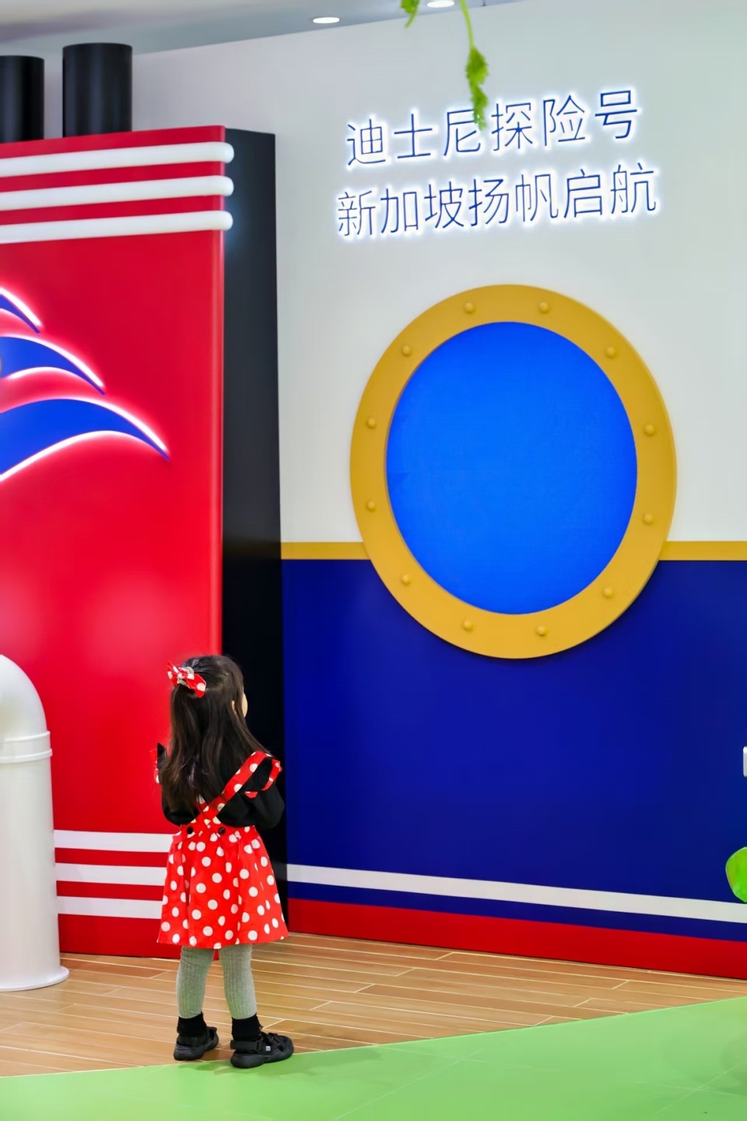 店内设计融合迪士尼游轮经典视觉特色,如红色烟囱、舷窗等,并复刻了游轮上“Disney Imagination Garden”主题区域的海上城堡与米奇造型绿植,吸引了不少市民驻足参观。此处既是游轮上演出的重要场景之一,也成为本地游客互动打卡的新亮点。