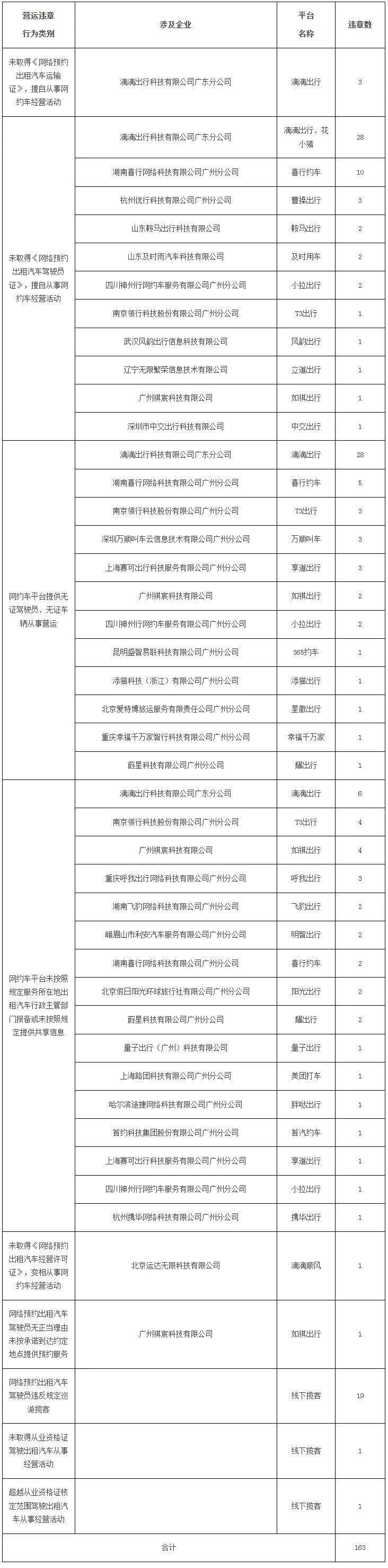 执法监管方面,2025年10月,广州市交通运输执法部门共立案查处网约车相关违章163宗,其中涉及网约车平台的违章142宗(包括网约车平台违章86宗,网约车驾驶员违章58宗),线下揽客21宗。滴滴出行科技有限公司广东分公司(滴滴出行)、湖南喜行网络科技有限公司广州分公司和南京领行科技股份有限公司广州分公司等3家平台公司涉及违章案件数量排名居全市前三位。无证车辆从事营运违章有3宗,占网约车相关违章总数的1.84%,在该类网约车违章涉及平台中,滴滴出行科技有限公司广东分公司(滴滴出行)涉及3宗。