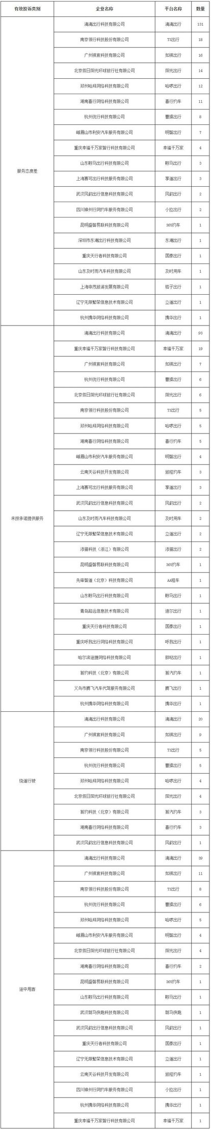 服务投诉方面,2025年10月,广州市交通运输主管部门共办结广州12345政务服务便民热线转办的网约车乘客有效投诉555宗,滴滴出行科技有限公司(滴滴出行)、广州祺宸科技有限公司(如祺出行)、南京领行科技股份有限公司(T3出行)的乘客有效投诉数量在全市网约车平台中排名前三位。其中“服务态度差”类投诉为238宗,占有效投诉总数的42.88%,“服务态度差”类投诉中滴滴出行科技有限公司(滴滴出行)比例最高,为131宗,占该类投诉总数的55.04%。