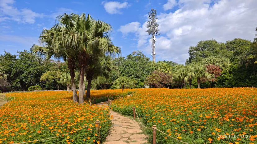 花木园内近1000平方米的硫华菊花海,金黄花朵随风起伏,宛如金色波浪。