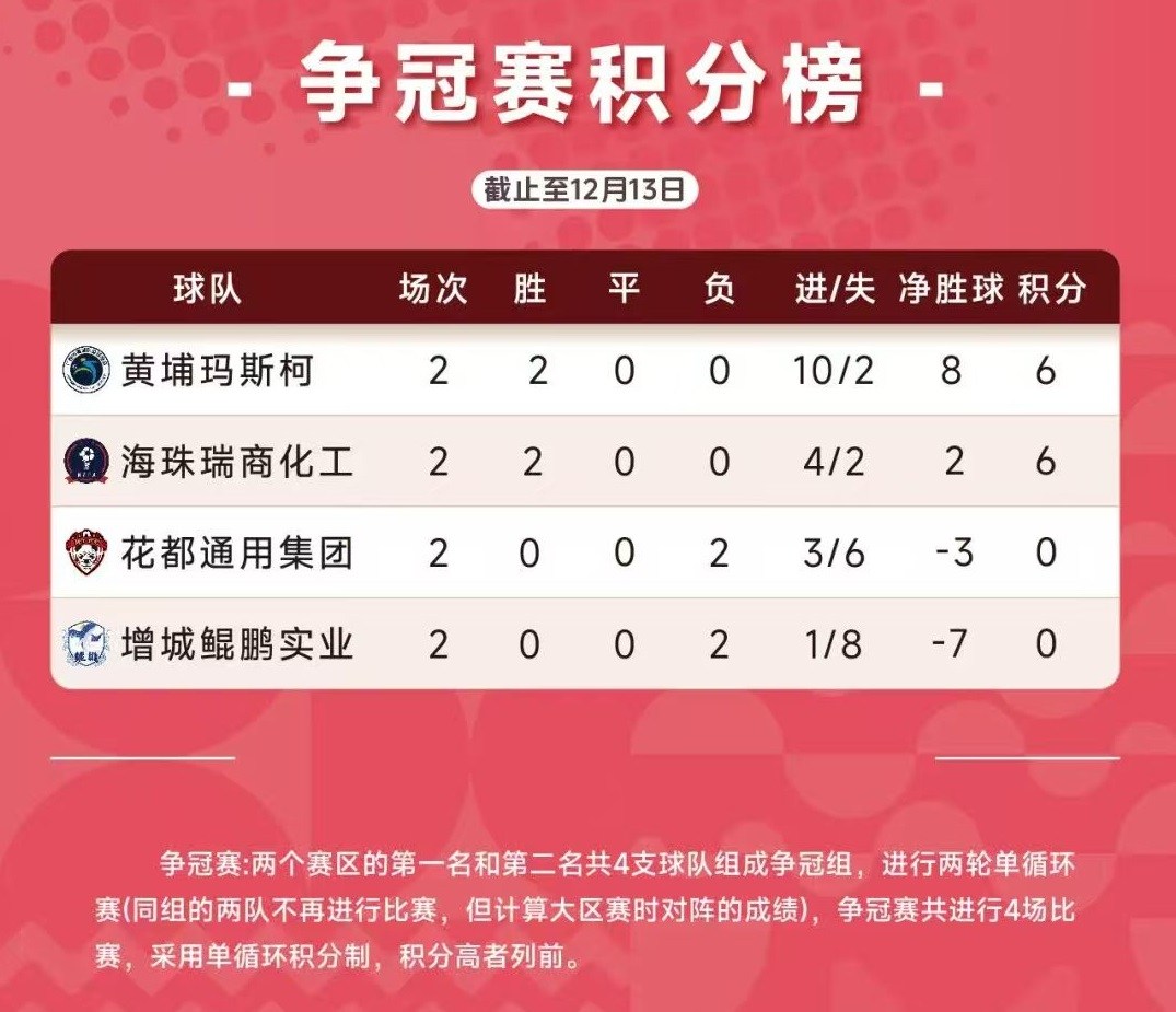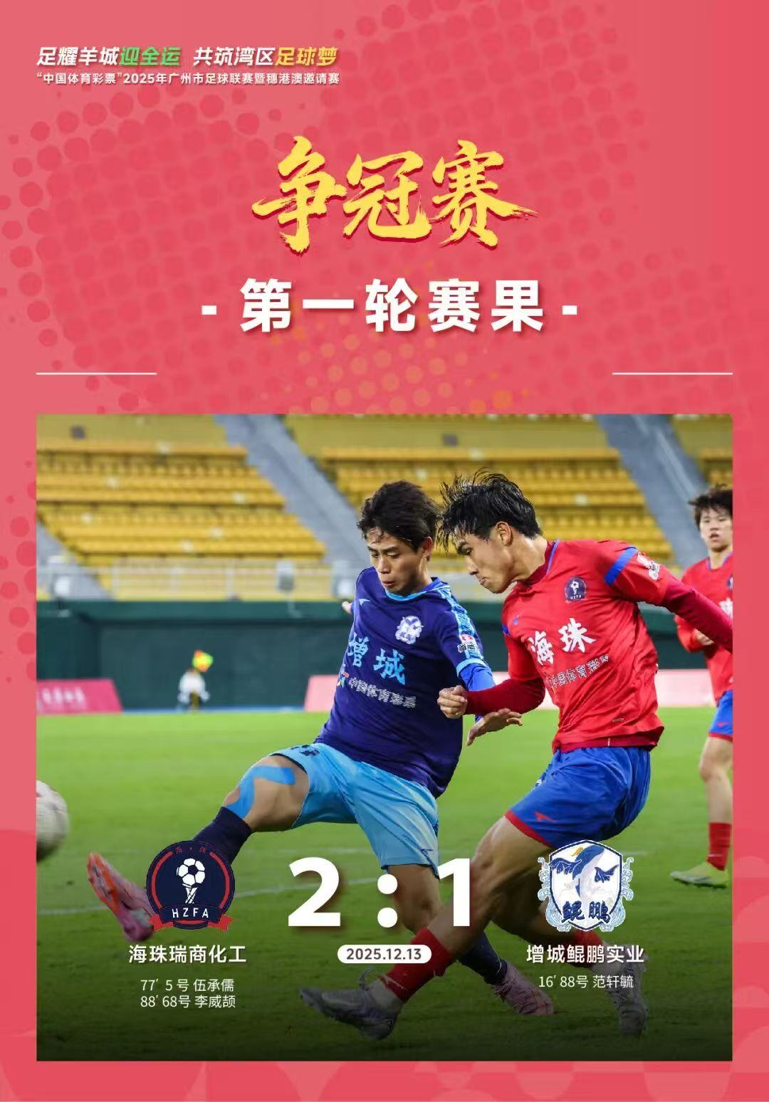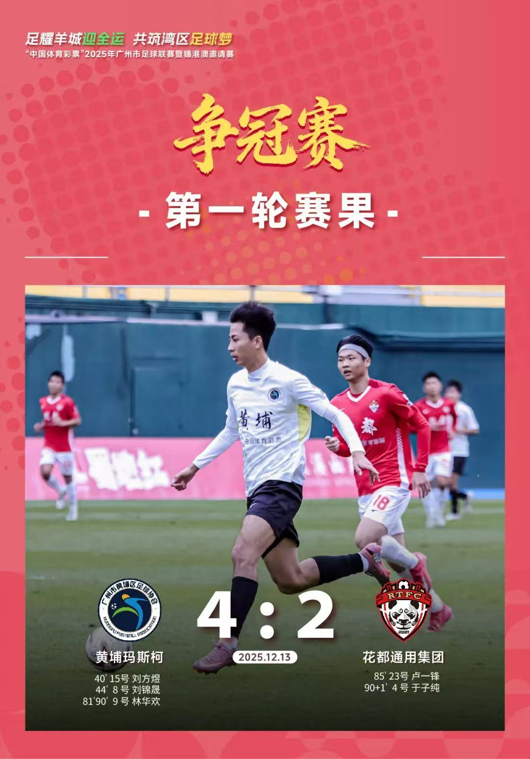 12月13日,“中国体育彩票”2025年广州市足球联赛争冠赛首轮的两场比赛结束,黄埔玛斯柯、海珠瑞商化工分别击败各自对手,稳居争冠赛积分榜前二。