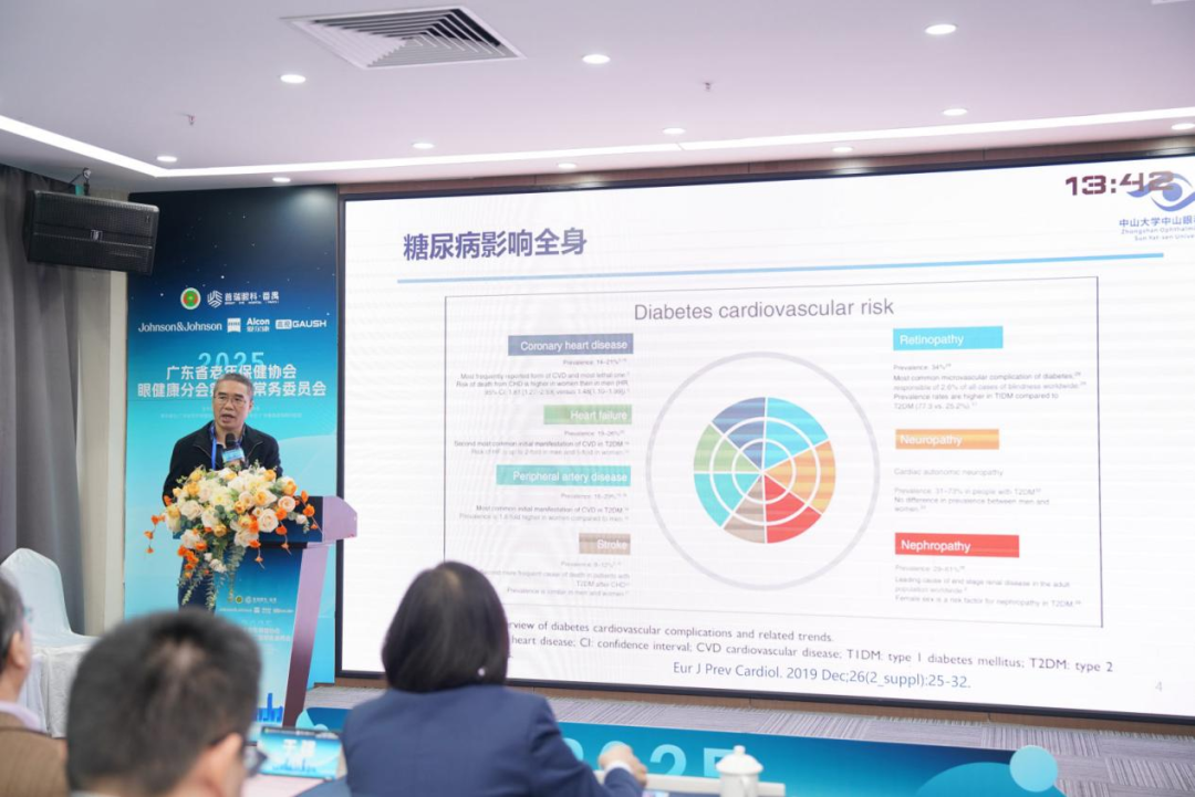 中山大学中山眼科中心黄文勇教授讲课题目为《一专多能:糖尿病视网膜病变的筛查与全身并发症的管理》,他表示糖尿病及视网膜病变是全球重大的公共卫生问题,而糖尿病视网膜病变的筛查可识别心血管疾病或认知障碍等视觉损伤之外的疾病,提高患者筛查的依从性。例如,一张眼底照相结合AI技术,可以检测无症状脑缺血,预测脑中风风险;也可以辅助诊断糖尿病性肾病,以及发现痴呆的生物标记等。
