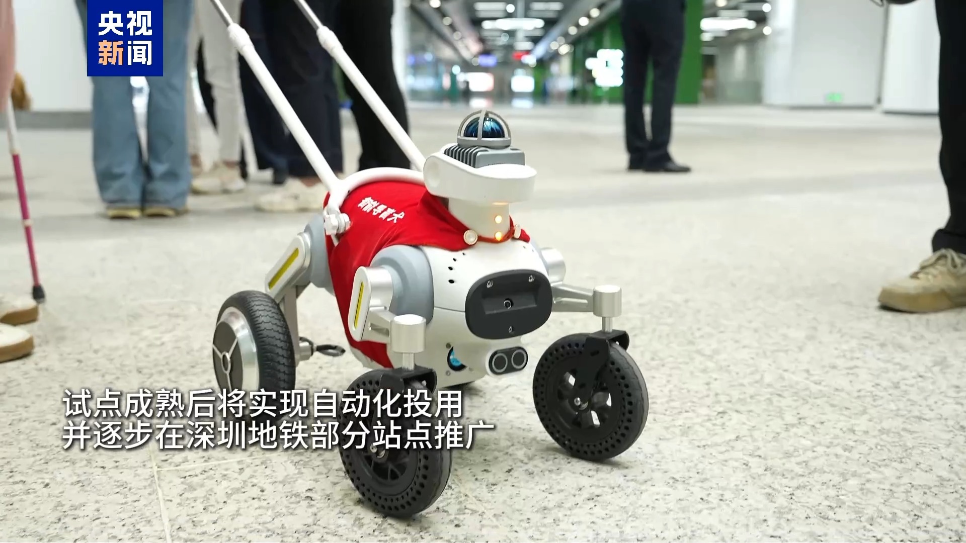 12月13日,深圳地铁在黄木岗交通枢纽试点启用智能导盲犬“小蒜”,为视障人士提供科技出行解决方案。