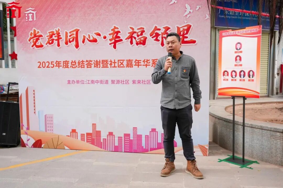 为表彰社区先进典型,深化党群互动,营造温馨祥和、邻里互助的社区氛围,12月14日上午,由江南中街道、聚源社区、紫来社区居委会主办、信息时报承办的“党群同心·幸福邻里”2025年度总结答谢暨社区嘉年华系列活动第一站,在聚源社区党群服务中心户外广场顺利开展。活动通过表彰先进、互动游园、公益服务等多种形式,吸引近百名党员、楼长、志愿者、居民代表及亲子家庭参与,现场欢声笑语,暖意融融。
