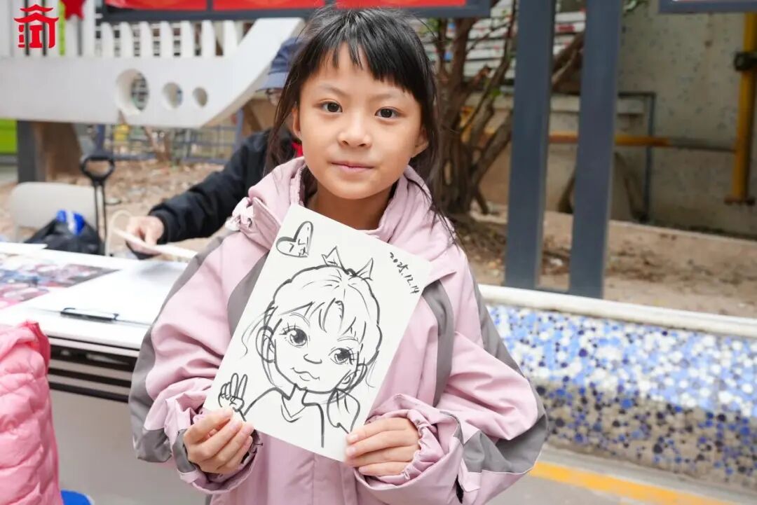 树华美术的加入成为一大亮点——专业老师为小朋友们现场绘制可爱的人物肖像画,孩子们排队等待,手捧画像时满脸喜悦。