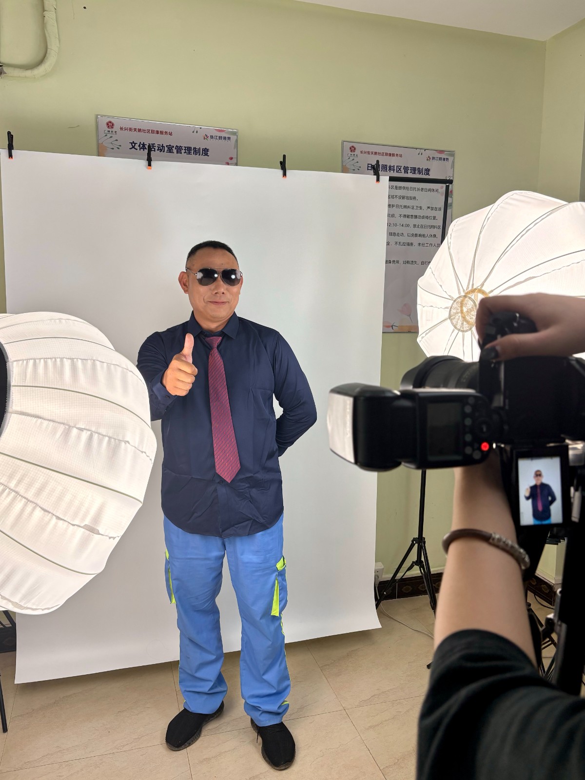 摄影棚内,快门声此起彼伏,一张张笑脸被定格。摄影师耐心引导,从紧张的姿势到自然的笑容,从闪躲的眼神到自信的目光,环卫工人们逐渐放松,露出最真实的自己。