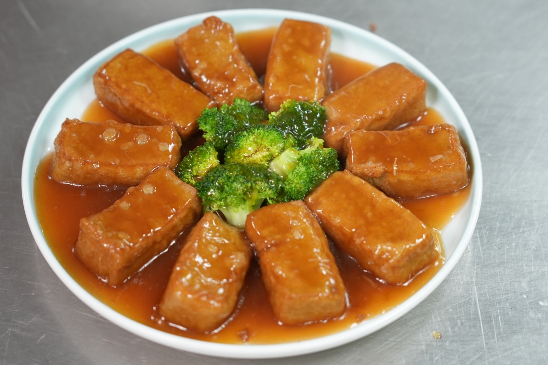 自制鲍汁豆腐:豆腐是每天用黑豆和黄豆现做的,炸过之后,外酥里嫩,还带着豆子的醇香,浓郁鲍汁把这个“鲜”字体现得淋漓尽致,回味悠长,深受食客喜爱。