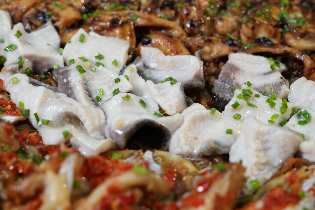 簸箕大盘鱼:很有水乡特色的一道菜。传统的簸箕蒸更好地保留了鱼的鲜味,一盘鱼有三种口味,现点现蒸,底下铺上一层河粉,蒸出来的鱼肉又嫩又多汁。正!豉汁鱼的香、剁椒鱼的辣、清蒸鱼的鲜,三者都在一条鱼上面呈现出来,河粉也吸收所有的滋味,更是精华所在。