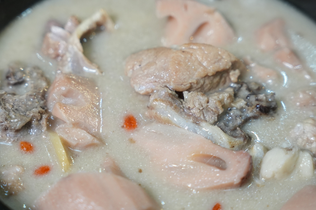 莲藕筒骨煲:选用万顷沙本地的莲藕,口感绵密软糯;筒骨和莲藕经过慢炖后汤色奶白。天气冷的时候点一锅,喝完浑身都暖和。