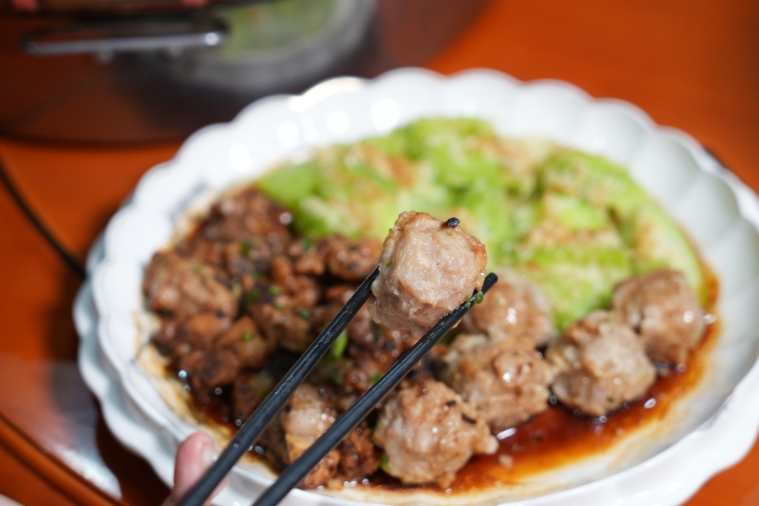 特色蒸三样:手打猪肉丸弹牙,排骨软烂,丝瓜清甜,调味简单却非常可口,尽显食材本真,一口下去,是经典的粤式家常风味。
