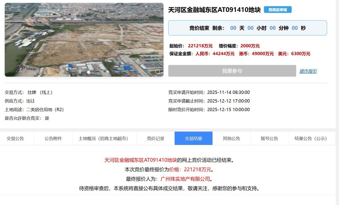 珠江实业再次落子天河区金融城东区。12月15日,天河区金融城东区AT091410地块竞拍,广州珠实地产有限公司以221218万元底价获得地块。