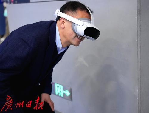 超感体验元宇宙VR眼镜,由于过于逼真,佩戴者一边行走一边体验,呈现出生动的表情和动态。