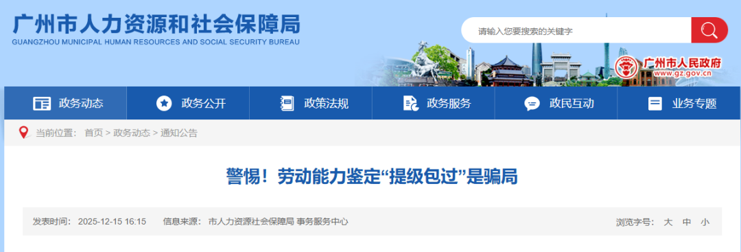 【广州市相关部门严正声明:警惕!劳动能力鉴定“提级包过”是骗局】近日,广州市劳动能力鉴定委员会已发出严正声明:劳动能力鉴定“提级包过”是骗局。该委员会呼吁广大职工和社会各界共同监督,抵制扰乱劳动能力鉴定秩序的不法行为。详情>>>