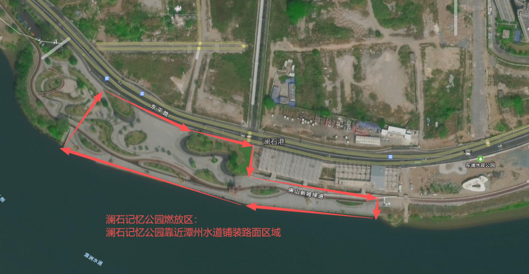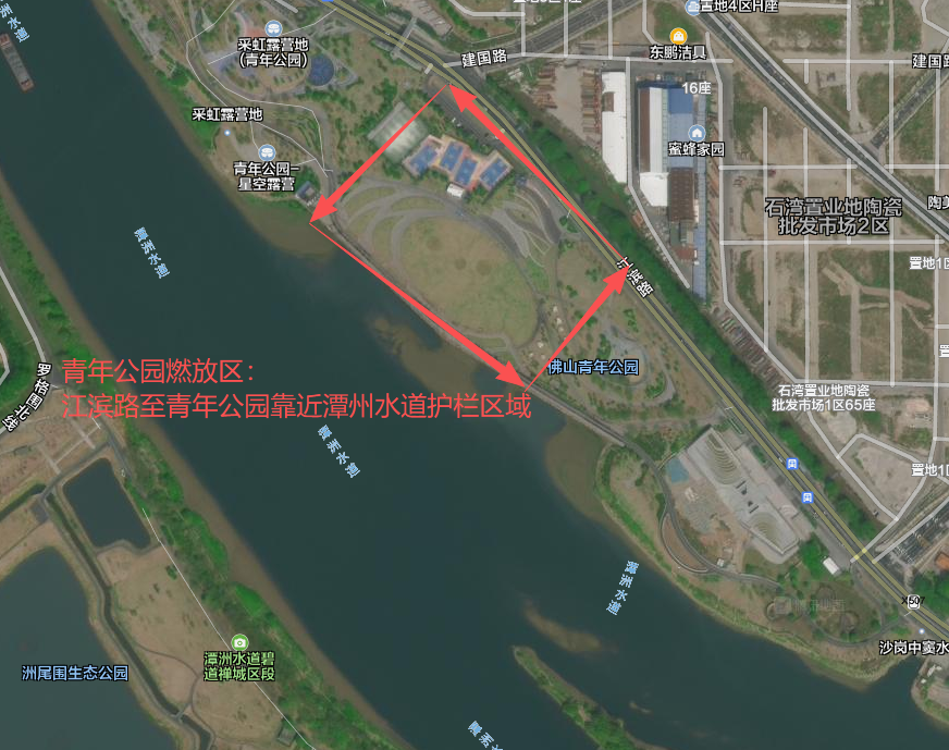 南庄镇: ①万科情人港燃放区域;②罗南村龙湾大桥底公园燃放区域 ③上元周尾围公园燃放区域 ④紫南仁园燃放区域 石湾镇街道: ①青年公园燃放区域 ②澜石记忆公园燃放区域 ③半月岛湿地公园燃放区域