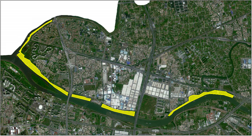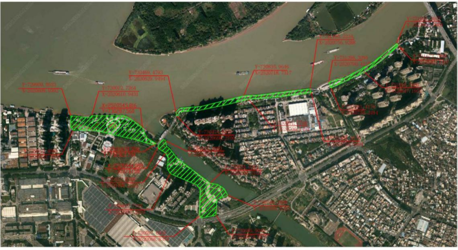 玉带公园至二龙水闸堤围段(潭洲水道特大桥东西两侧50米除外),陈北大桥(离桥100米)至佛陈大桥(离桥100米)堤围段(华阳桥东西两侧50米、潭洲恒力码头范围除外)。