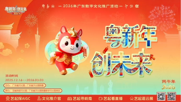 记者从广东省文化馆获悉,为响应“请到广东过大年”号召,推动互联网条件下的新大众文艺繁荣发展,“粤新年·创未来”2026年广东数字文化推广活动将于2025年12月16日至2026年3月3日期间举办。