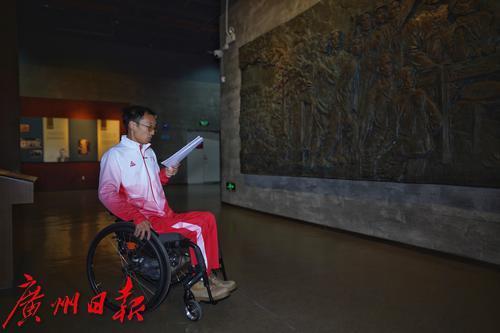 原辛亥革命纪念馆天使讲解员,现为广东轮椅击剑队选手黄晋冬正在讲解前做功课。他在今年的残特奥会上摘得轮椅击剑项目男子个人佩剑C级金牌。