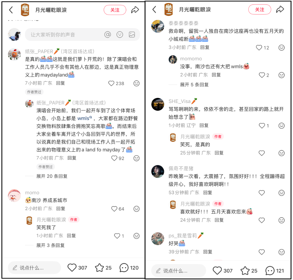 小红书用户@纸张_PAPER(湾区首场达成)说:“这是真正物理意义上的MAYDAYLAND。”因为在那里的只有所有和演唱会有关的人们,浓度超高。“小岛上都是wmls,大家在路边野餐交换物料放肆集合拥抱笑忘高歌。”ta描绘的这个美丽场景是所有经历过五月天【】25周年巡回演唱会广州站的人们都亲身经历过的。