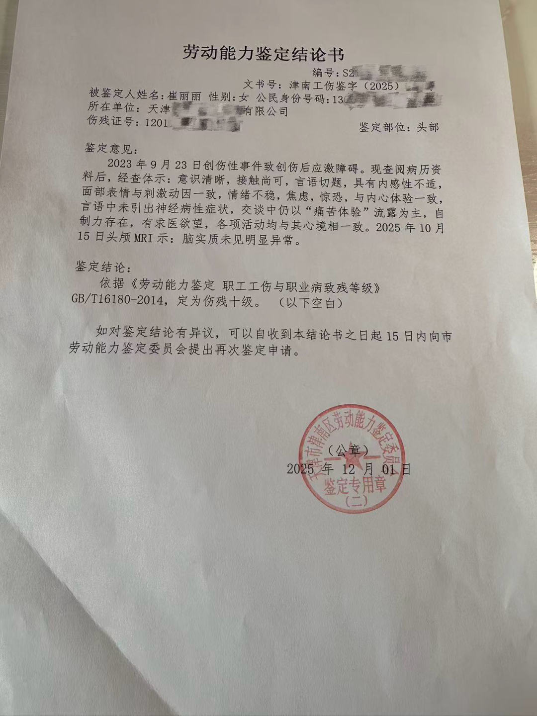 12月17日,记者从全国首例“性侵工伤认定”案当事人崔丽丽处获悉,近日她收到了劳动能力鉴定结论书和天津市劳动能力鉴定委员会颁发的十级伤残等级工伤伤残证。崔丽丽表示,会将这份鉴定结论,正式提交给工伤待遇案的主办法官。