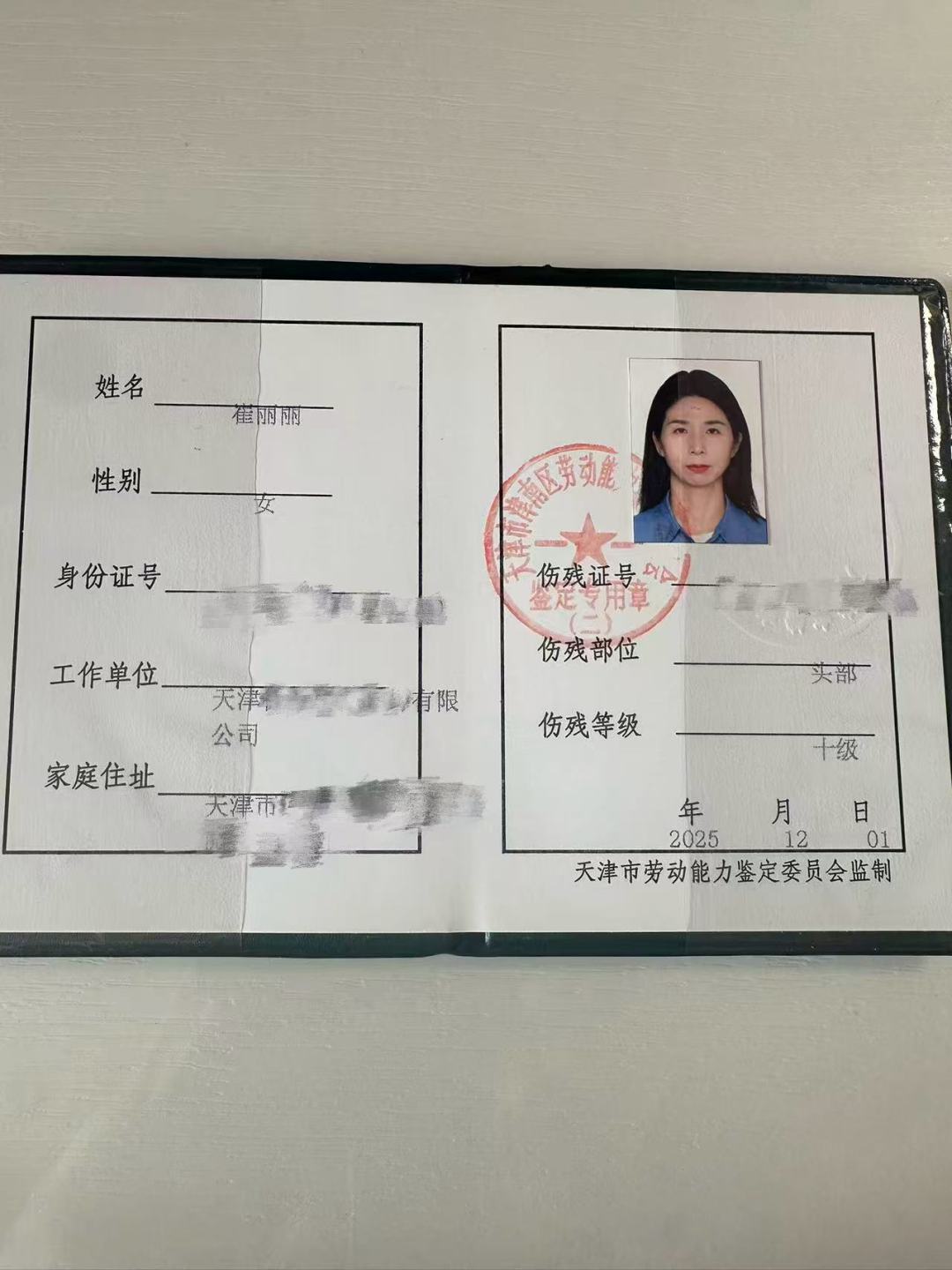 12月17日下午,崔丽丽告诉记者,经过了80多天的煎熬等待、经过了一系列法定程序,她因职场性侵导致的精神伤害——创伤后应激障碍(PTSD),被正式评定为工伤十级伤残。崔丽丽向记者出示了天津市职工工伤伤残证,该证由天津市劳动能力鉴定委员会制。