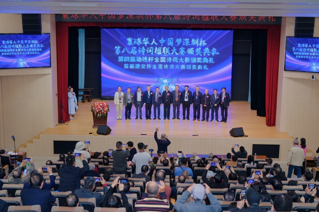 12月13至16日,寰球华人中国梦·深圳杯第八届诗词楹联大赛、第四届“助残杯”全国诗词大赛、首届“建安杯·对酒当歌”诗词大赛联合颁奖典礼在深圳举行。活动由中华诗词学会、广东中华诗词学会、深圳市文学艺术界联合会、深圳市残疾人联合会指导,深圳市长青诗社承办,深圳诗词学会特别支持。颁奖典礼期间,系列文化雅集,文采风流,墨香氤氲。