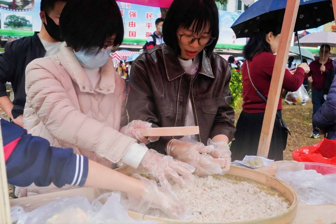 另一边,传统美食区则是一片热气腾腾的人间烟火气息。米饼、糖环、油角、艾糍……这些承载着新丰记忆的特色美食,在学生们的手中揉捏、成型、烹制,香气弥漫了整个校园。