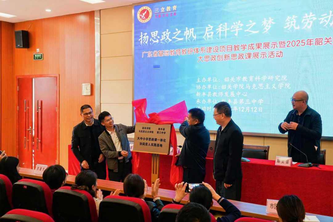 研讨会的高潮,是“韶关学院马克思主义学院—新丰县第三中学——大中小学思政课一体化协同育人实践基地”的正式揭牌。这块沉甸甸的牌匾,不仅标志着校地合作的深化,更象征着一条打通学段、协同育人的长效机制正在粤北大地扎根。