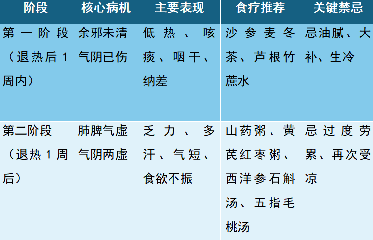 典型表现:已不发烧或仅有低热,但仍有咳嗽、咽喉不利、口干、精神不振、食欲欠佳等症状。此阶段以清透余热、宣肺化痰、兼顾气阴 为主。