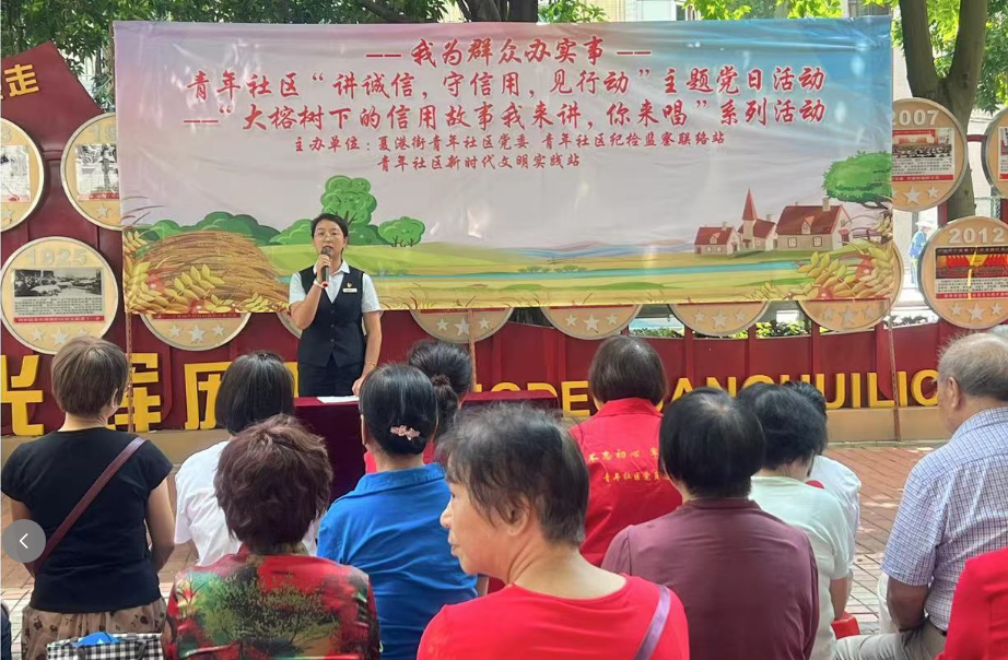 以社区“大党委”和网格“大支部”为核心,开展“讲诚信、守信用、见行动”主题活动,通过“大榕树下讲信用故事”“诚信书柜漂流”“信用小课堂”“信用长廊”等特色形式,推动诚信文化融入学校教育、社区治理。党员带头示范、志愿者广泛宣传,形成全社会共建信用生态的热潮。