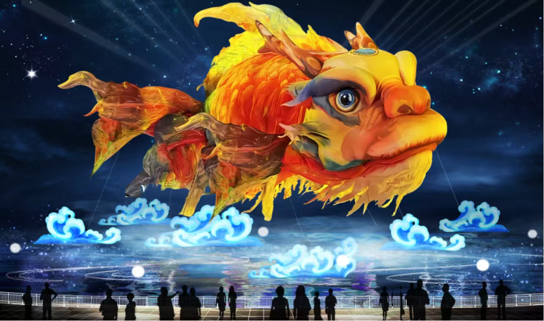 “鳌鱼凌云”灯组以中国上古神话中的鳌鱼为核心原型设计,通过动态结构、光影特效与水境融合,诠释“鳌鱼出海,福泽四方”的吉祥寓意,同时传递人与自然和谐共生的生态理念。