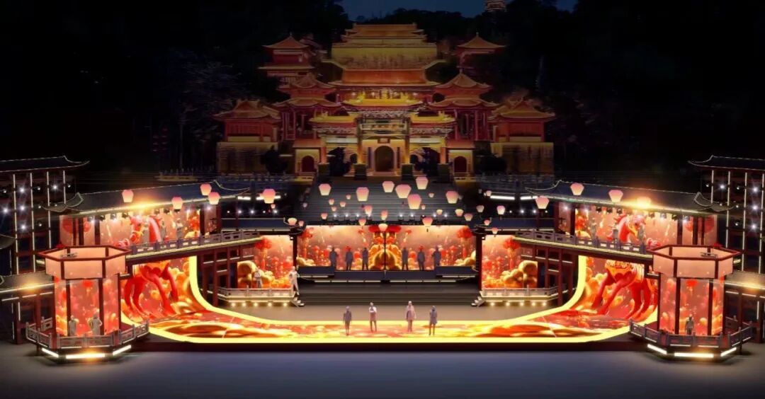 “诗韵岭南 珠江春晚及亮灯仪式主舞台”以传统建筑构建舞台主体,盛开的满树花朵展现花城活力,呈现繁花似锦的吉祥图景,打造兼具传统韵味与当代审美的新春盛典舞台,彰显粤港澳大湾区文化自信与时代魅力。