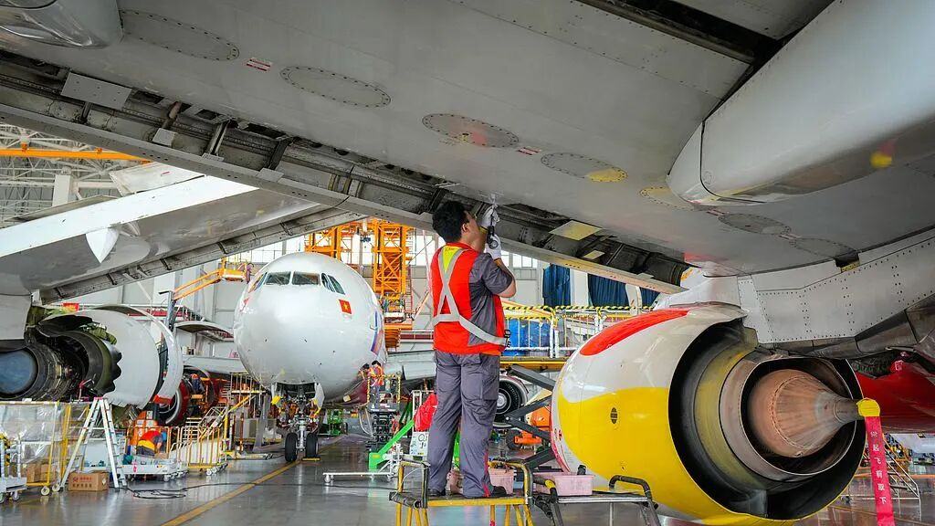 △2025年9月23日,海口,海南自贸港一站式飞机维修产业基地机库,机务维修人员对飞机进行检修。