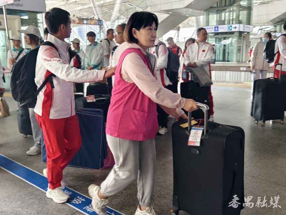 石壁“花姐”为视力障碍运动员引路、推行李箱