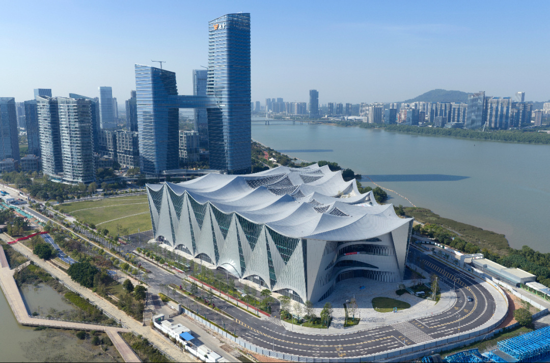 担纲设计的广东省建筑设计研究院介绍,设计以“千帆竞渡、科技远航”为核心理念,将项目雕刻为数个富有节奏的风帆与海浪隐喻的形体。起伏变化丰富的屋面造型形成独特的海浪动感,外立面风帆状穿孔铝板单元围合出灵活通透的半室外空间,建筑与周边江流绿景深度融合,喻示大湾区科创力量扬帆远航、奔涌向前的精神风貌。