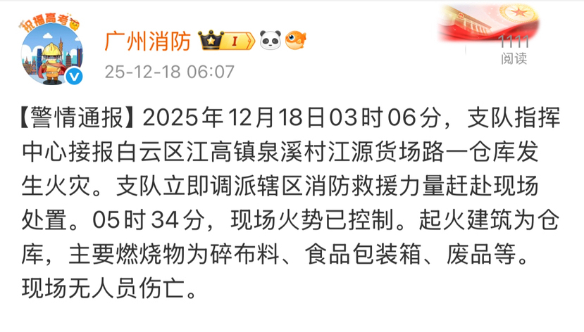 据广州市消防救援支队通报,2025年12月18日03时06分,支队指挥中心接报白云区江高镇泉溪村江源货场路一仓库发生火灾。支队立即调派辖区消防救援力量赶赴现场处置。05时34分,现场火势已被控制。起火建筑为仓库,主要燃烧物为碎布料、食品包装箱、废品等。现场无人员伤亡。