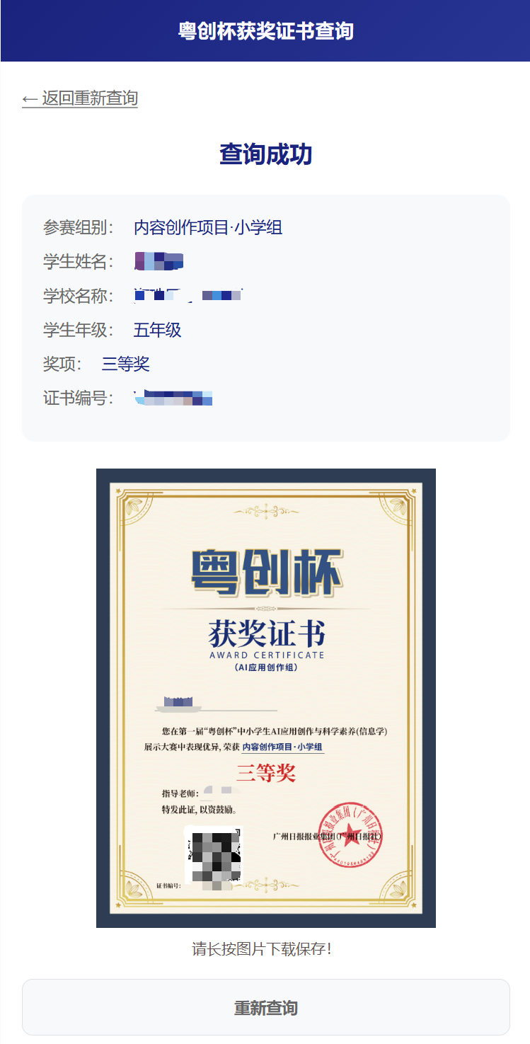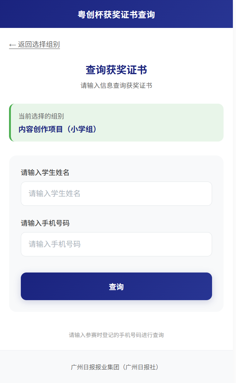 各赛项的二等奖、三等奖及优胜奖的获奖结果均已公布。获奖选手可前往大赛官方赛事网站或“广州日报新花城”客户端,进入“粤创杯”专题页的“获奖查询”通道,凭报名时所填的手机号及姓名进行验证后,查询结果并下载官方电子版获奖证书,永久留存这份数字荣誉。