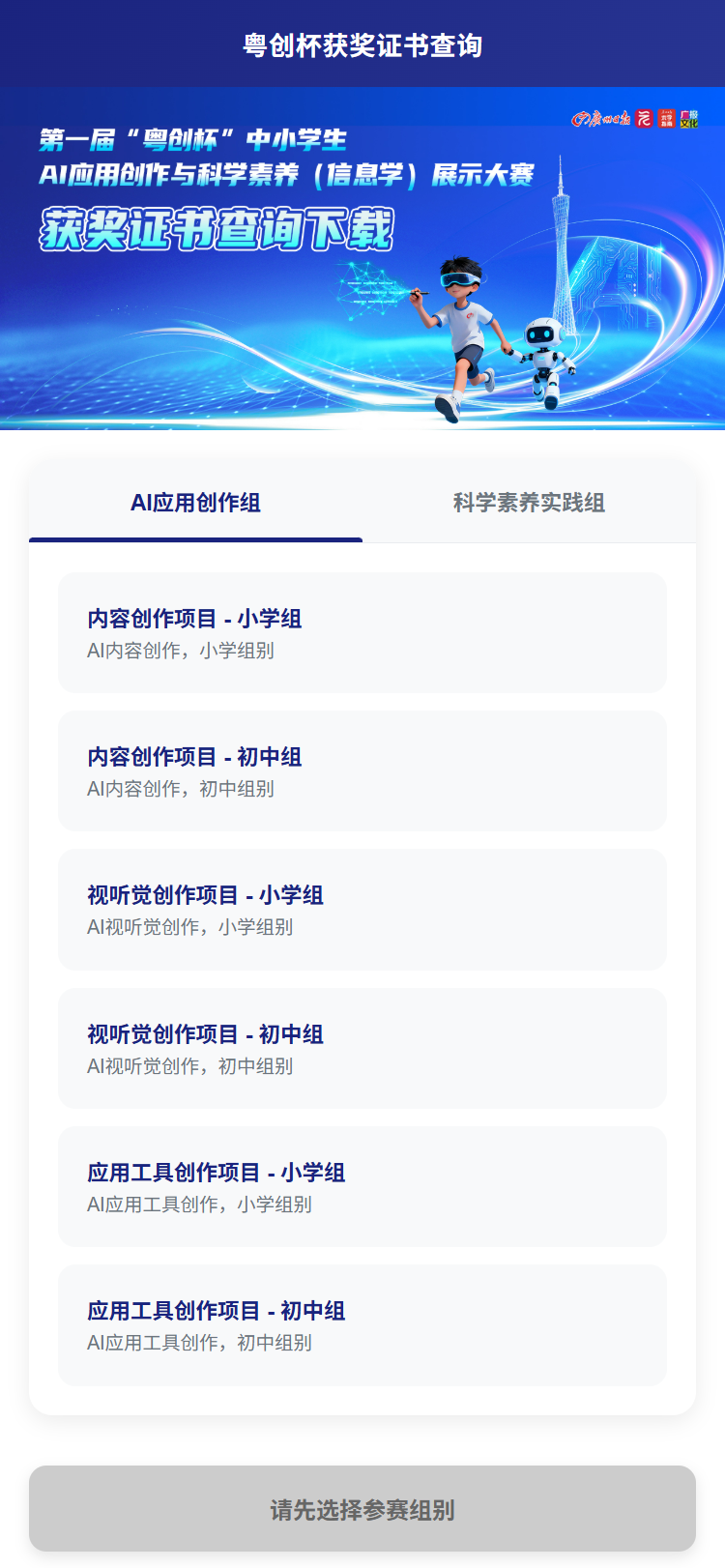 第一步:进入粤创杯专题页,打开获奖查询界面,选择参赛组别