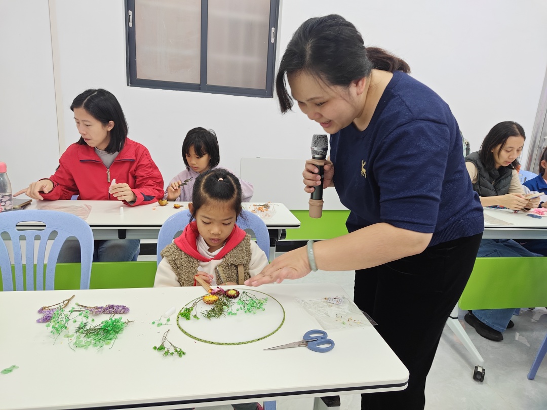 据了解,此次亲子活动是“花地街中市社区党群服务阵地‘破圈’聚能 提升服务质效”项目活动之一。当天下着小雨,但活动气氛热烈,家长们早早陪着小朋友来到现场。“今天是什么日子?”“很快就要到元旦了。”在主持人引导下,孩子们从材料包里取出干花,为即将到来的佳节制作一把寓意团团圆圆的团扇。指导老师展示了精美的干花团扇成品,详细讲解了制作方法。在老师和家长指导下,小朋友们花心思秀出“花心意”,勿忘我、彩菊等各色干花经精心排布,在扇面上化作充满童趣又各具特色的图案。其中,坐在前排的一对小姐弟,思路大不同:弟弟把干花材料堆叠在扇面中间,图案质朴;姐姐精心调整每一支花的长度,扇面疏密有致。