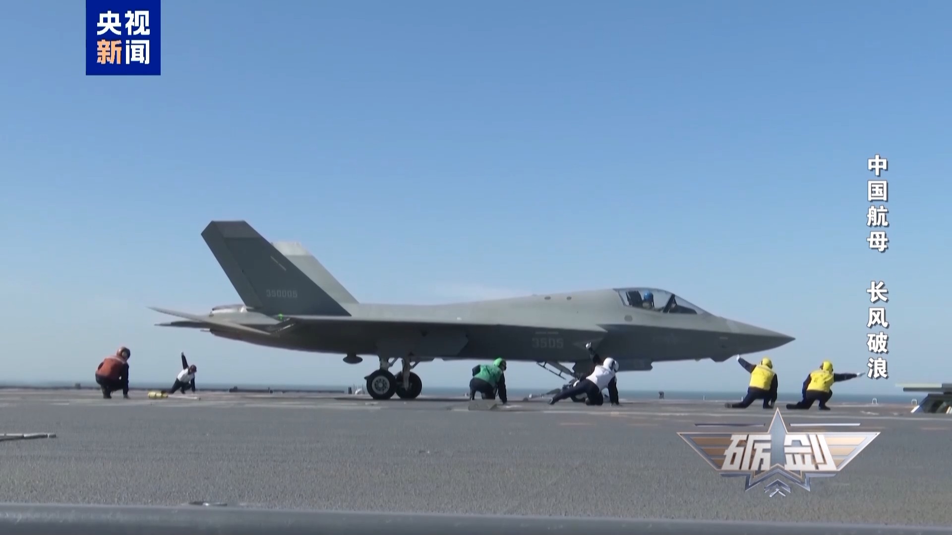 宽阔的飞行甲板上,4道阻拦索、3个弹射起飞位格外醒目,歼-35、歼-15T、空警-600等新型舰载机依次停放。