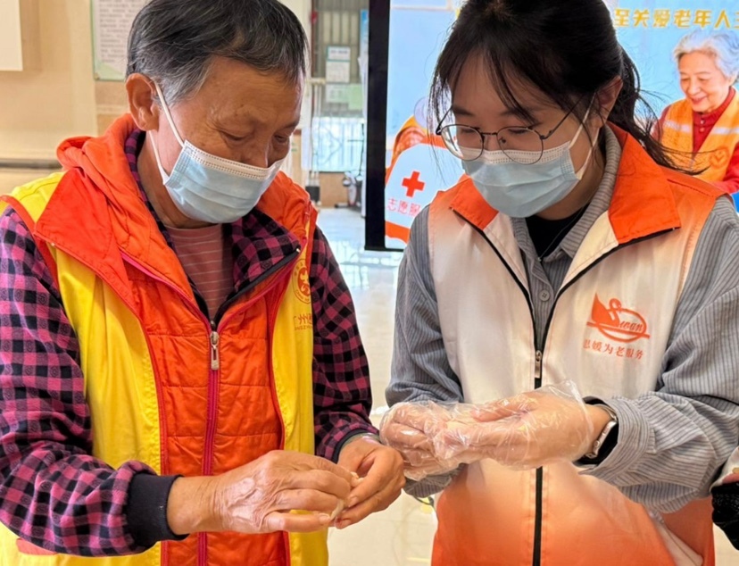 两边场地的美食陆续出锅,志愿者将圆仔带回颐康中心与饺子汇合。随后组成“温情派送队”,带着装满爱心饺子和暖心圆仔的保温餐盒,前往服务对象家中。志愿者为服务对象递上温热的餐食,与长者展开交谈,了解长者近期生活状况,关心长者近日身体情况,并叮嘱昼夜温差大,注意增减衣物。