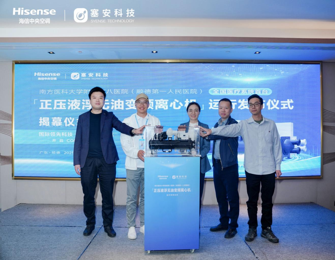 会上,海信日立向院方授予“绿色医院示范单位”牌匾,向塞安科技授予“战略合作伙伴”荣誉,标志着三方在绿色医院建设中的深度协同。随后,嘉宾们共同揭幕,象征全国医疗系统首台正压液浮无油变频离心机正式投入运行。