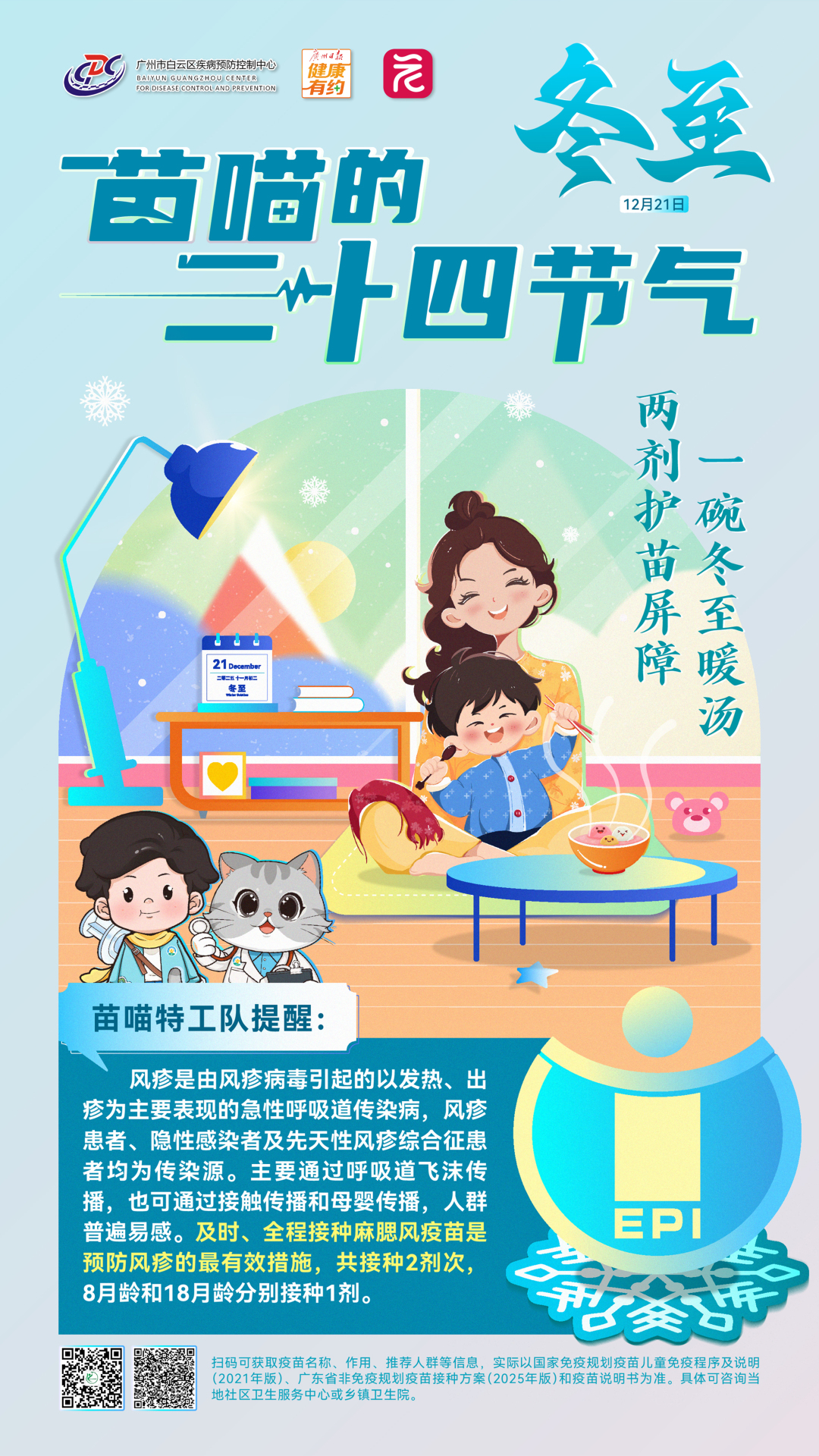 冬至时节,注重“藏”与“防”。除了接种疫苗,保持室内空气流通、养成良好手卫生习惯、在人群密集处佩戴口罩等措施,也能有效降低感染风险。若出现发热、皮疹等症状,请及时就医并隔离至出疹后5天,保护自己也保护他人。