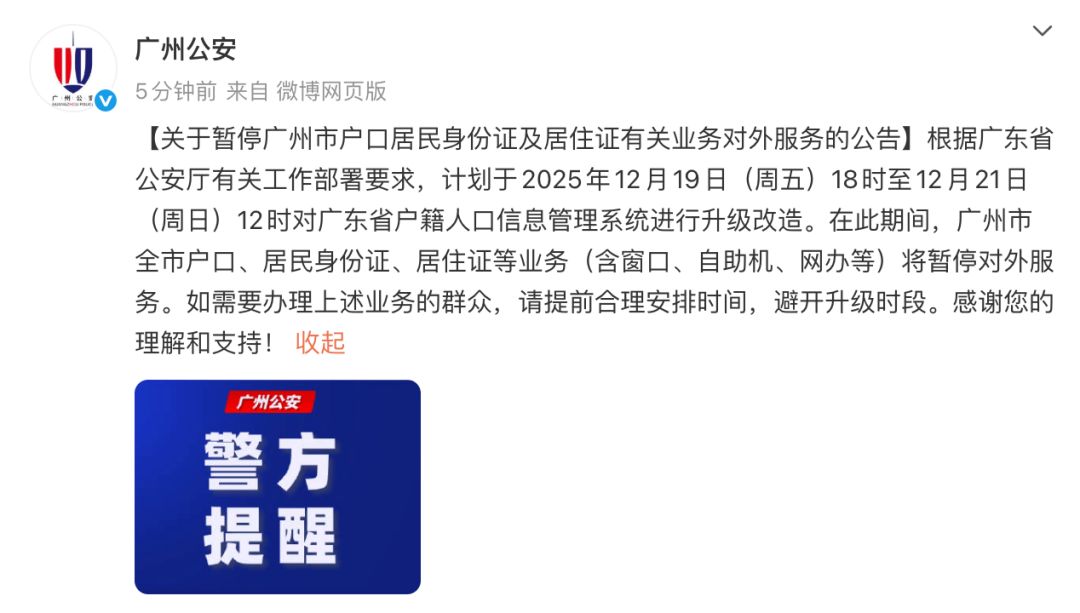 12月19日下午,广州公安发布公告称,根据广东省公安厅有关工作部署要求,计划于2025年12月19日(周五)18时至12月21日(周日)12时对广东省户籍人口信息管理系统进行升级改造。在此期间,广州市全市户口、居民身份证、居住证等业务(含窗口、自助机、网办等)将暂停对外服务。如需要办理上述业务的群众,请提前合理安排时间,避开升级时段。