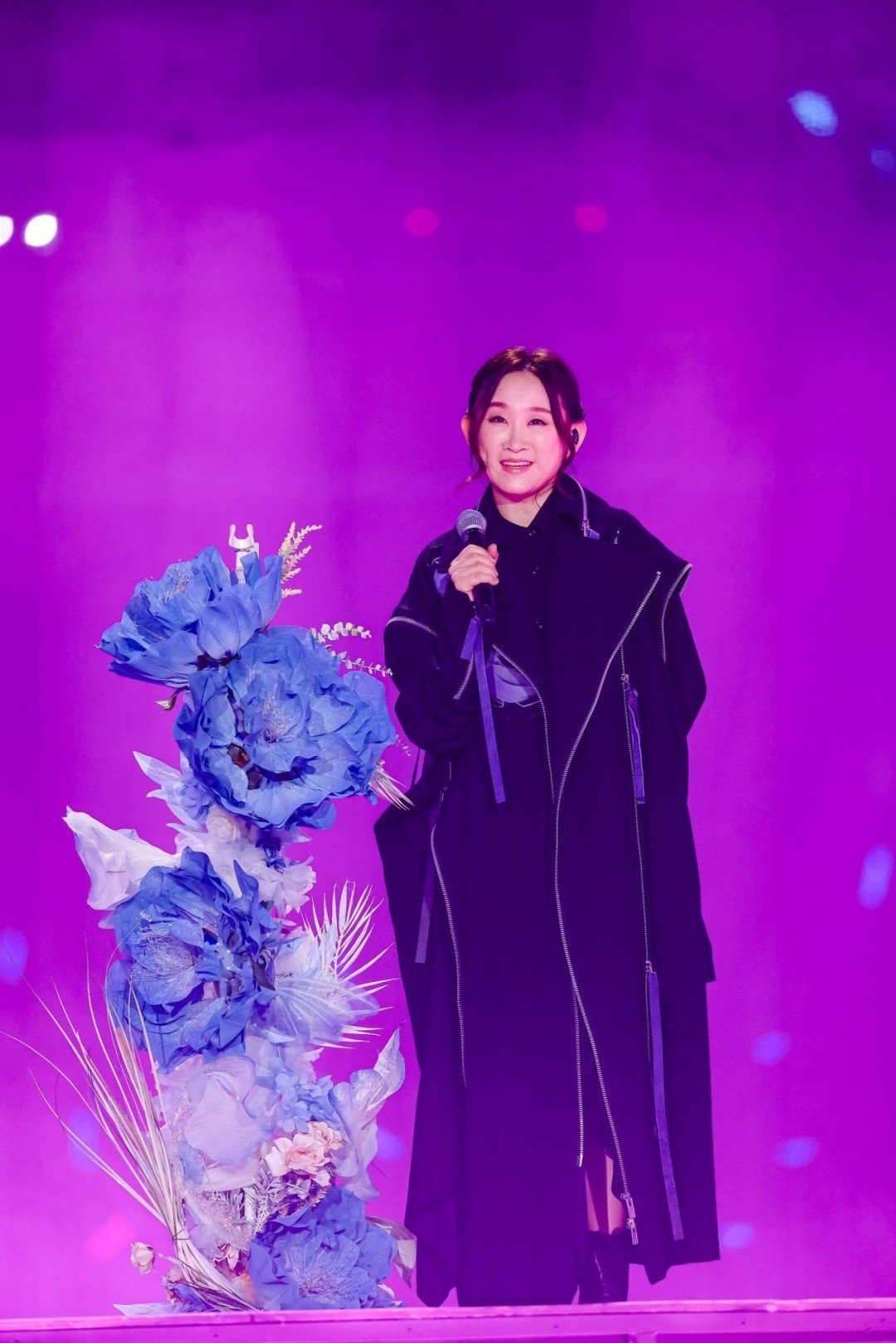 舞台上,立麦架被精心装饰成一株含苞待放的花枝,随着歌曲的推进,装置如约“开花”,与歌词“那棵树开花了”完美呼应。王菀之在演唱中与这朵“花”温柔互动。她坦言,在演唱时,脑海中不断浮现出自己看过的电影画面与情节,这份因光影而生的感动,让她在舞台上愈发投入与动容。