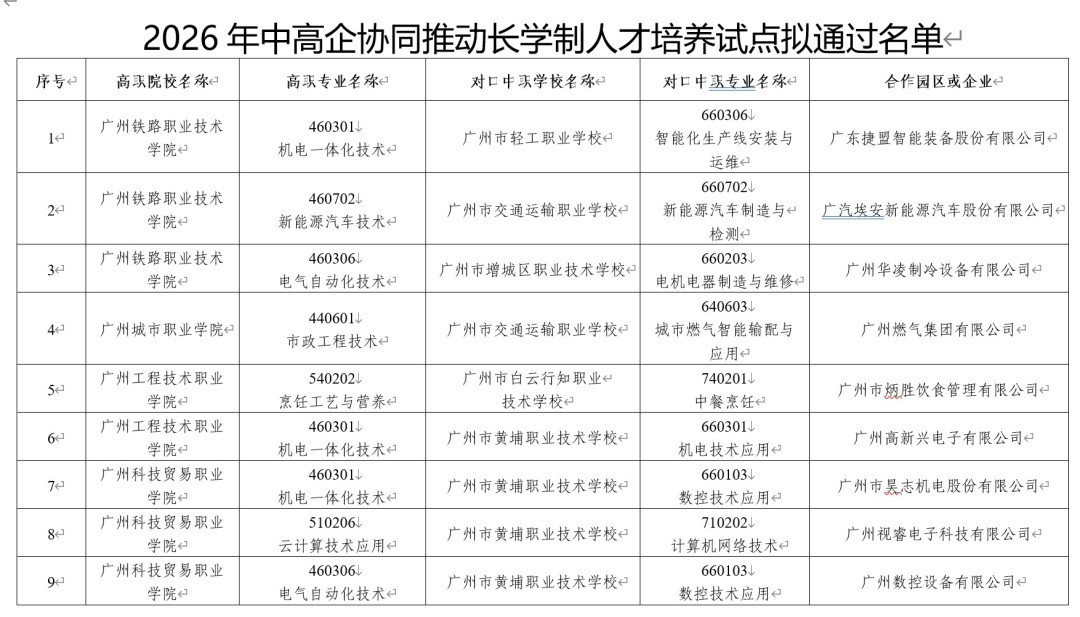 12月19日,广州市教育局正式公示2026年“中高企协同推动长学制人才培养试点”拟通过名单,共有20个项目入选,覆盖智能装备、新能源汽车、信息技术、医药健康、现代服务业等重点产业领域。这标志着广州在深化产教融合、构建中高企一体化育人体系方面向前迈出一步。