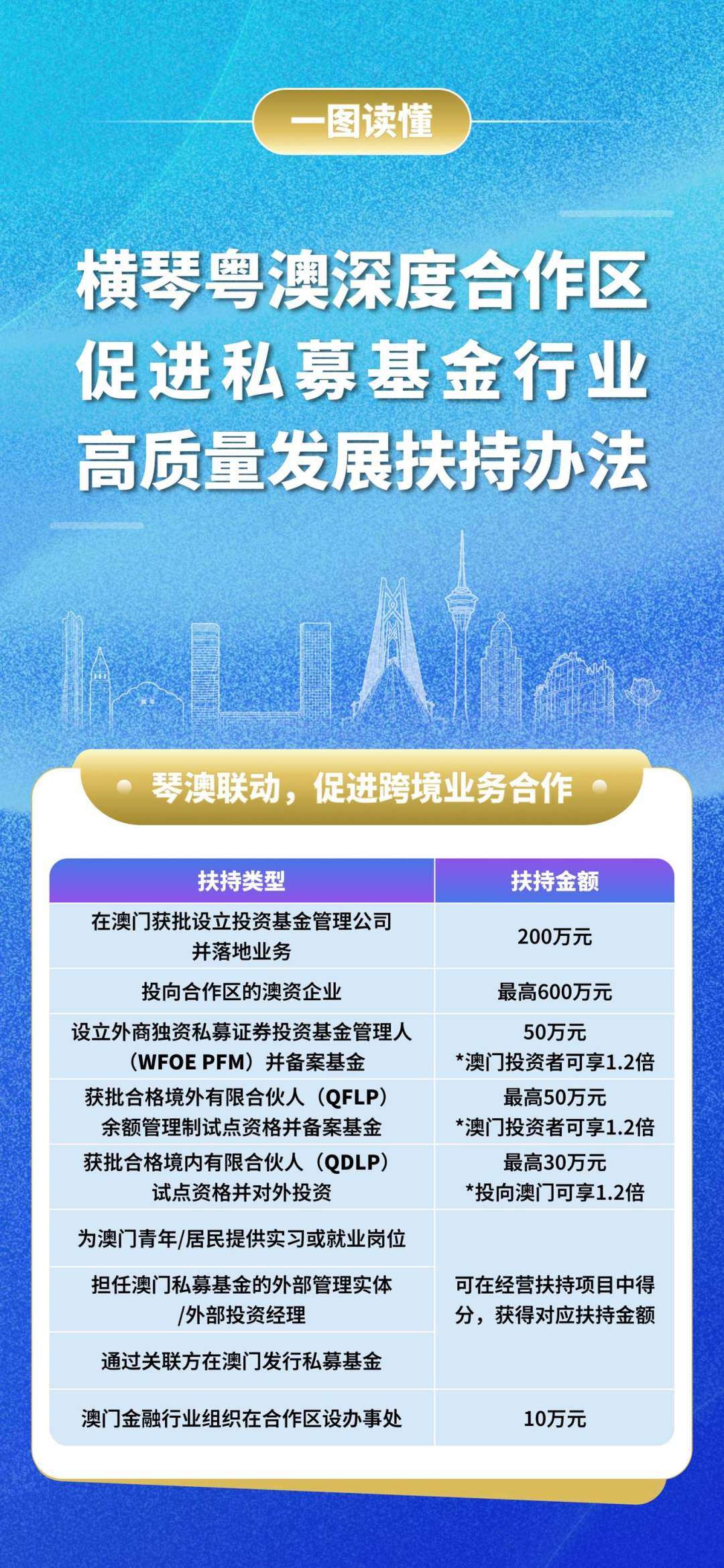 《私募扶持办法》是合作区贯彻落实《横琴粤澳深度合作区建设总体方案》及《关于金融支持横琴粤澳深度合作区建设的意见》等相关金融支持政策精神,进一步推动私募基金行业在合作区创新发展的重要举措。通过各类扶持措施,引导优质私募机构在合作区持续做深做实实质性运营、拓展多元化业务,同时深化琴澳两地私募基金业的联动发展。