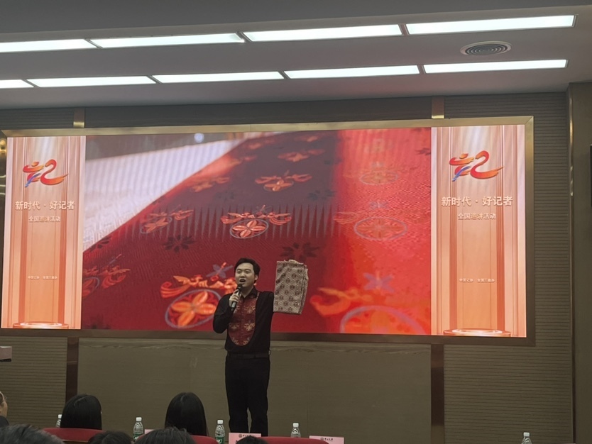 “这块布,能看到线和线交织在一起的纹路。就像记者在媒体融合时代,将传统与现代、文化与经济、传播与实践的线编织在一起。”广西崇左市融媒体中心电视编辑部副主任张韦以《老手艺里的中国经济新活力》为题,讲述了运用融媒体手段赋能非遗壮锦传承发展的创新实践。在他看来,“记者不应只是记录者、参与者,更应该是变革者”。通过468条短视频、520场直播,他带领团队助力壮锦文创产品走出乡村、远销东盟,助力相关产业扩大至千万级规模,织就一张张幸福的笑脸。