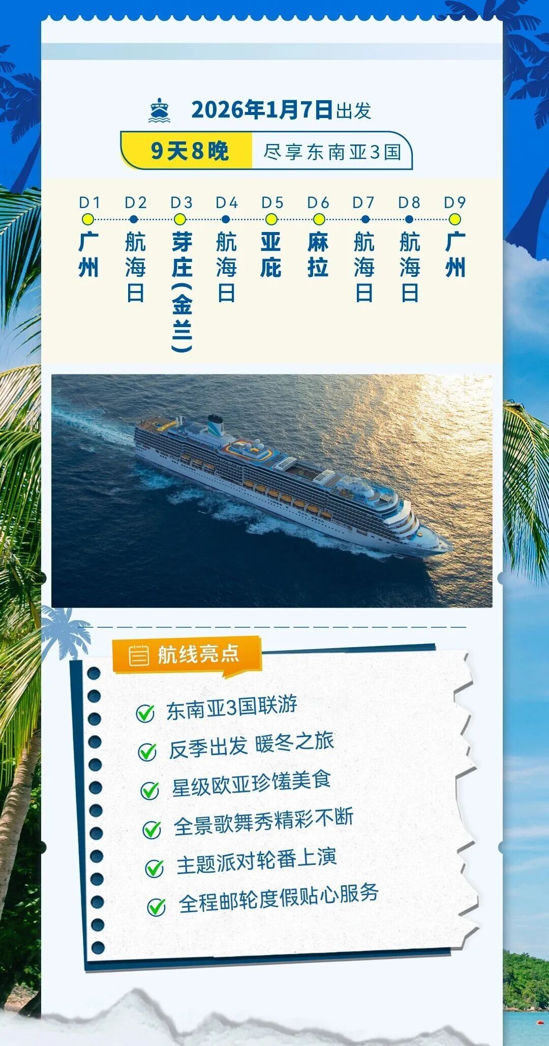 值得期待的是,爱达·地中海号还将于2026年1月7日及3月11日推出两个9天8晚的中长航线,覆盖越南、马来西亚、文莱等国的多个目的地,带领大湾区宾客共赴暖冬之旅。
