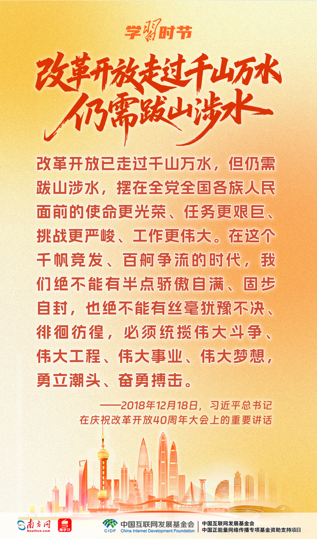 “在新时代,中国人民将继续自强不息、自我革新,坚定不移全面深化改革,逢山开路,遇水架桥,敢于向顽瘴痼疾开刀,勇于突破利益固化藩篱,将改革进行到底。”