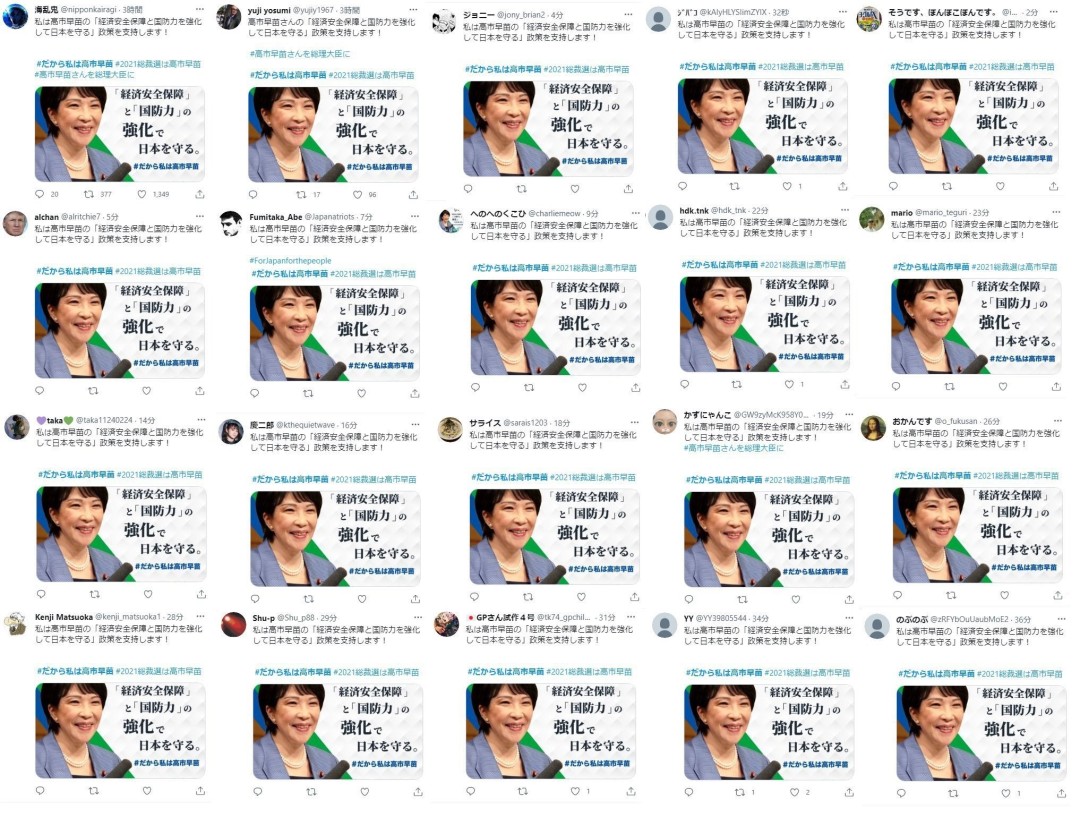 日本社交媒体平台充斥如“当然只能支持高市早苗”“高市早苗拜托了”等内容相似的帖文。